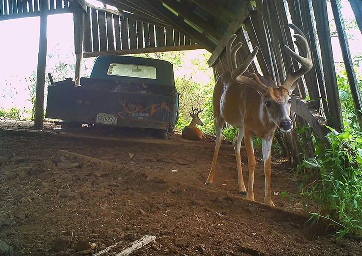 Hier haben sich zwei Rehe offenbar ein schattiges Plätzchen gesucht – und dabei das Risiko nicht gescheut, sich in die Nähe von Menschen und Fahrzeugen zu wagen. Normalerweise bleiben Wildtiere ja lieber auf Abstand, aber diese beiden scheinen alle Vorsicht über Bord geworfen zu haben. Sie haben sich gemütlich in einem Stall breit gemacht, bis einer von ihnen die Kamera entdeckte.