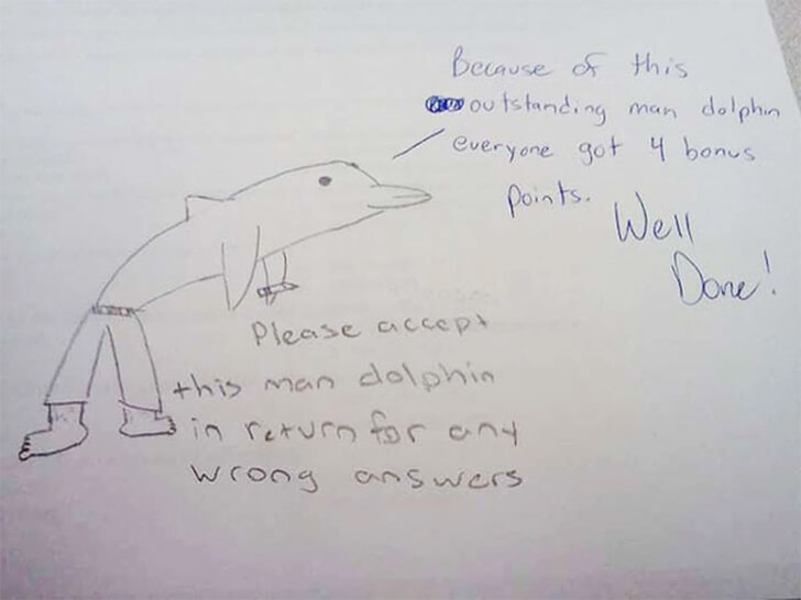 Mit leerem Kopf in die Prüfung? Keine gute Idee – außer man hat die Fantasie eines Künstlers. Als ein Schüler merkt, dass er die Antworten auf dem Prüfungsbogen nicht kennt, greift er zu einem unorthodoxen Plan. Statt Lücken mit Text zu füllen, lässt er seine Fantasie sprudeln – und zeichnet einen Delfin, der durch die Fragen schwimmt.