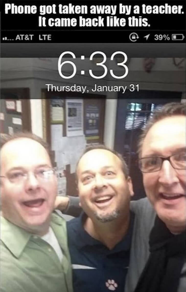 Mit breitem Grinsen stellten sie sich vor die Kamera und schossen ein Foto, das prompt als Hintergrundbild des Handys landete. Als der Schüler sein Gerät zurückerhielt, staunte er nicht schlecht: Drei strahlende Lehrergesichter blickten ihm entgegen. Ob er sich in dem Moment wohl dachte: “Das passiert mir nicht nochmal!”?