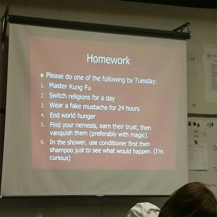 Ein ganz normaler Schultag? Von wegen! An der Wand hängt eine Hausaufgabenliste, die mehr nach Fantasy-Roman als nach Schulalltag klingt. Bis Dienstag sollen die Schüler nicht nur Kung-Fu erlernen, sondern auch den Welthunger besiegen und ihre Erzfeinde mit magischen Kräften vertreiben. “Vergesst nicht euren Mut – und vielleicht auch einen Zauberstab!”, könnte der Lehrer augenzwinkernd hinzufügen.