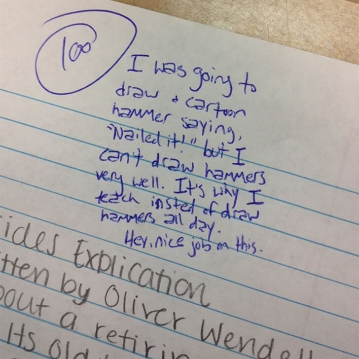 Statt der Standardfloskel schreibt sie einen Kommentar, der so schnell nicht vergessen wird: „Wenn ich zeichnen könnte, würde ich hier einen Hammer malen, weil du den Nagel exakt auf den Kopf getroffen hast.“ Ohne dass auch nur ein einziger Strich auf dem Papier ist, zaubert diese Bemerkung jedem Leser ein Grinsen ins Gesicht.