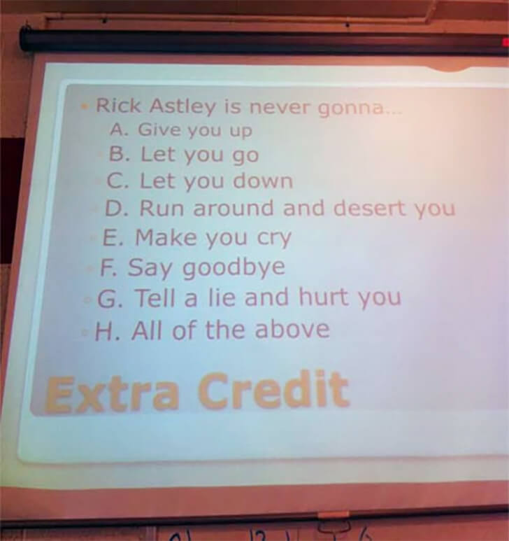 Ein ganz normaler Multiple-Choice-Test? Nicht dieses Mal! Eure Lehrerin hat sich einen Scherz erlaubt, der alle überrascht: Die Antwortmöglichkeiten sind keine Fakten, sondern Textzeilen aus “Never Gonna Give You Up” von Rick Astley. Die ersten Schüler blicken noch irritiert auf die Fragen, doch bald wird klar, was hier läuft.