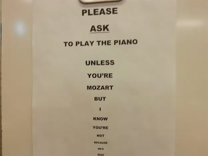 Die Botschaft ist klar: Wer sich für einen musikalischen Virtuosen hält, sollte sich sicher sein, dass seine Finger auch tatsächlich den richtigen Ton treffen. Und wenn ihr euch trotzdem ans Klavier wagt, dann übt vorher eure beste Mozart-Pose – vielleicht drückt man bei euch ja ein Auge zu.