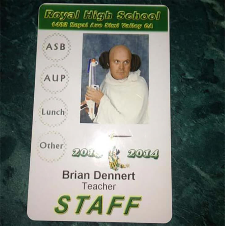 Mit zwei Kopfhörern als improvisierte “Leia-Zöpfe” und einer epischen Pose, die direkt aus einer weit, weit entfernten Galaxie stammen könnte, ließ er sein Foto für den Schulausweis schießen. Das Beste: Er forderte die Schüler heraus, sich ebenfalls als Aliens zu verkleiden – wer mitmachte, bekam Extrapunkte. Ein Lehrer, der die Macht des Humors nutzt, gewinnt das Herz seiner Schüler spielend!